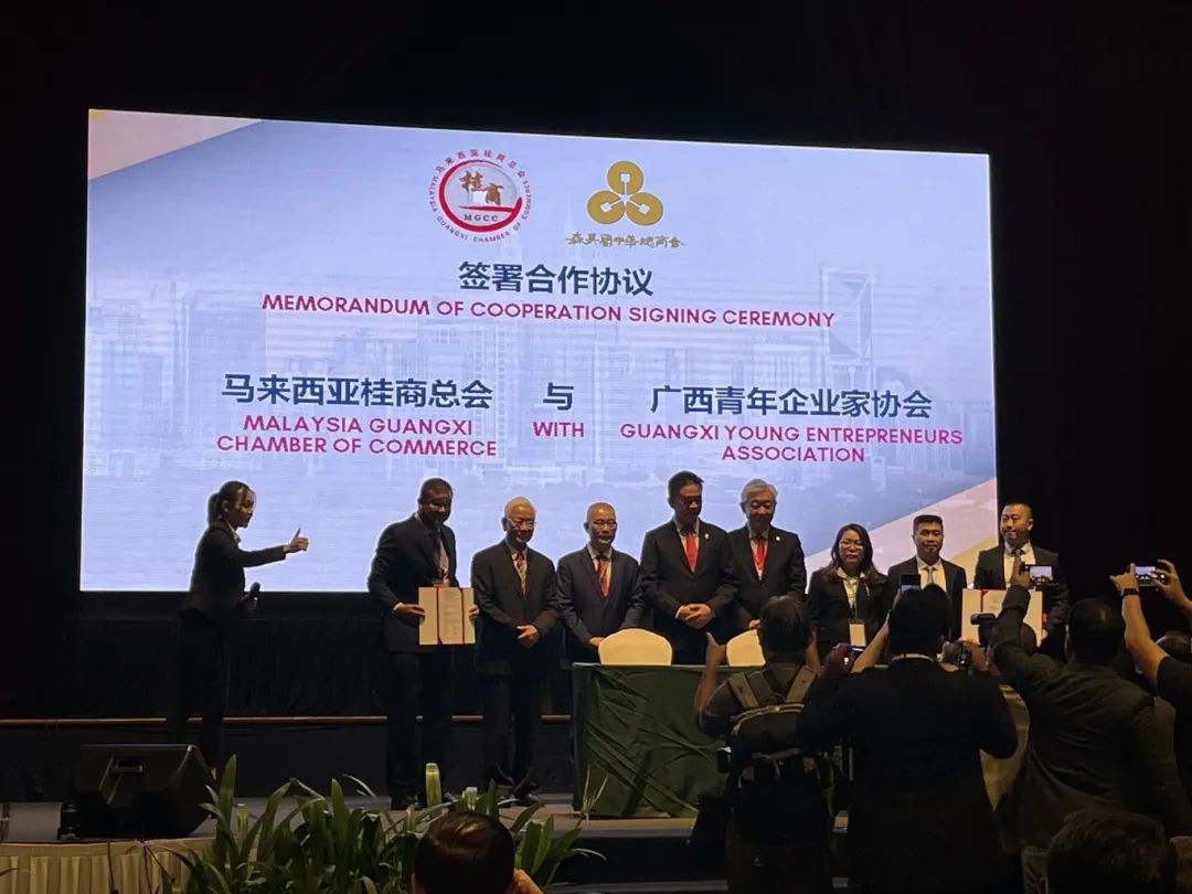 交流會(huì)上,廣西青年企業(yè)家協(xié)會(huì)常務(wù)副會(huì)長(zhǎng)莫呂斌與大馬桂商總會(huì)署理總會(huì)長(zhǎng)陳拔釗共同簽署合作備忘錄。龍其生會(huì)長(zhǎng)和拿督呂海庭等人共同見(jiàn)證。